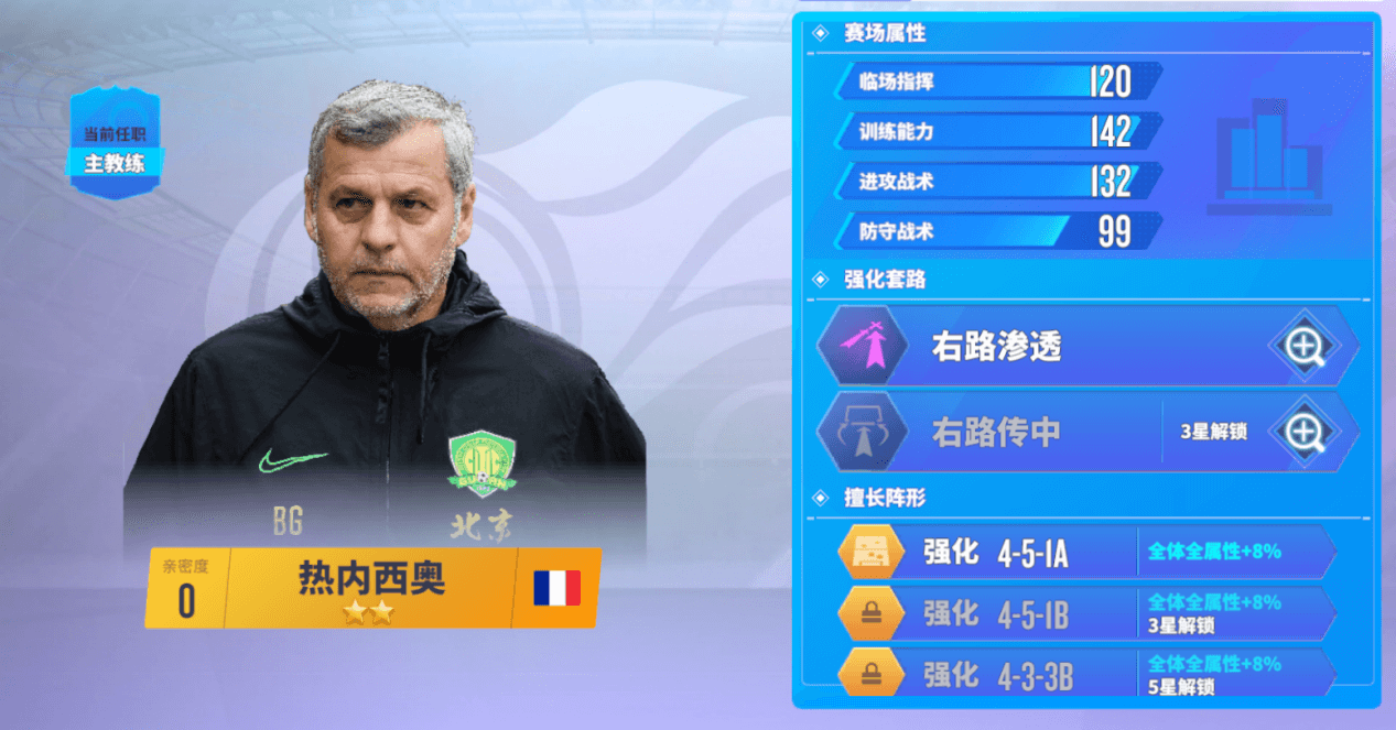 熱內西奧會給使用4-5-1A陣型的玩家提8%的戰力提升(如下圖),當熱內西奧升至3星時會解鎖強化4-5-1B陣型8%的戰力提升,當熱內西奧升至5星時會解鎖強化4-3-3B陣型8%的戰力提升,是前期提升戰力的有效方法。