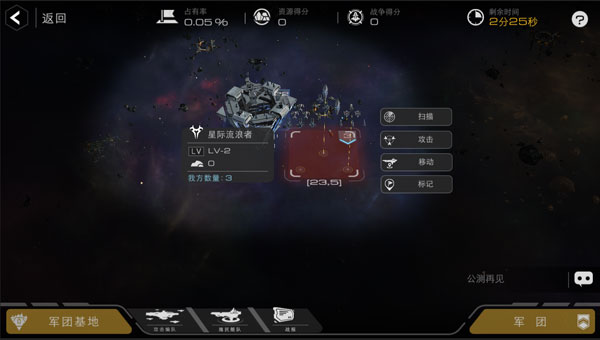 我們注意到在空間機庫的左下方多了幾個陣型按鈕,我們可以先使用1號陣型,在前3個位置上放肉盾,後3個位置上放輸出。添加好了編隊我們就可以開始進攻了,點擊空白的地塊會顯示該地塊的信息,我們先把編隊移動過去,到達目標點後我們就可以點擊攻擊了