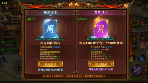 二:周卡月卡絕對是一個最值得投資的點,周卡每天送600鑽石,月卡每天送250W金幣,購買還立返同等鑽石,相當於免費獲得各種特權!包括戰寵自動出戰,裝備自動回收,掛機收益加成等各種福利!