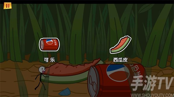 9、小蟲子在這裏乞討,說自己已經好多天沒吃飯了,這時火柴人在一個草叢中發現有一瓶可樂和西瓜,這裏選擇“西瓜”選可樂會被他的氣體噴飛;