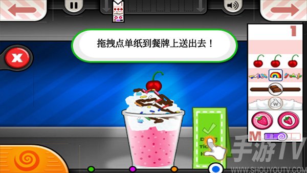 8、最後將小票單子拖到餐盤上即可把美食送給顧客。