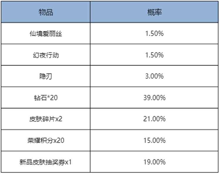 購買紅藍對決(1日),可額外獲贈一個禮包,打開後可隨機獲得以下之一:仙境愛麗絲、幻夜行動、隱刃、皮膚碎片x2、榮耀積分x20、新品皮膚抽獎券x1、鑽石x20。累計100次必得仙境愛麗絲和幻夜行動。