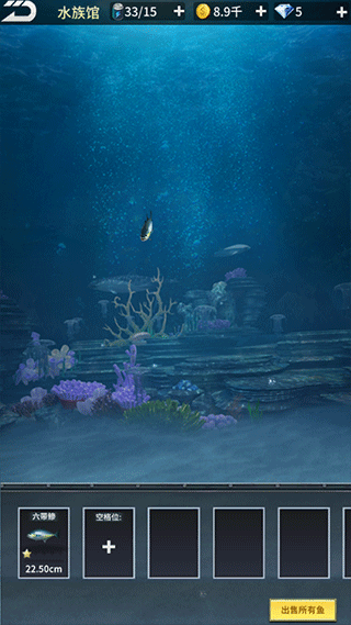 6、你也可以選擇直接銷售,轉換金幣進入賬戶,也可以采取“長期釣大魚”的想法,先“放”水族館一段時間,魚進入水族館會繼續進步,金幣會更高哦~