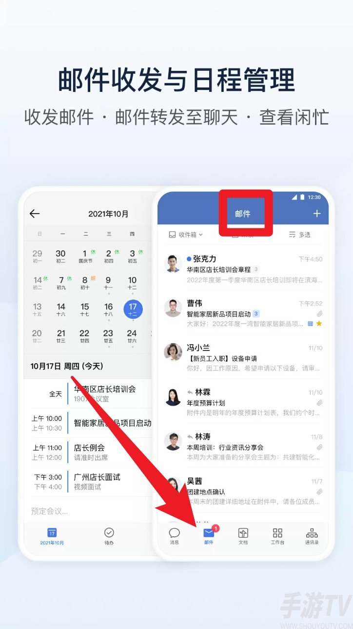 4. 進入「郵件」頁麵後可收發企業郵箱郵件,支持郵件轉發至聊天、日程同步查看會議安排等功能。