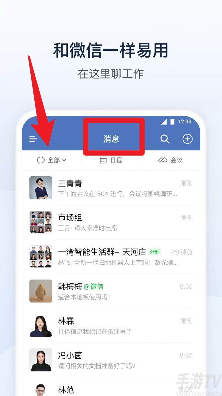 2. 登錄後默認進入「消息」頁麵,可查看工作群消息、日程提醒與會議通知,支持與同事高效溝通。