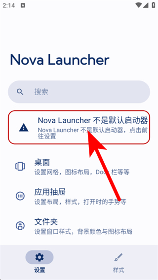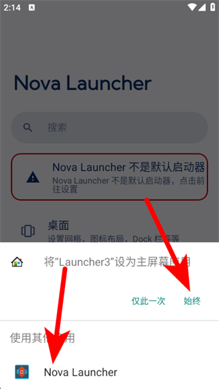 2、在Nova Launcher設置頁麵,點擊Nova Launcher不是默認啟動器提示區域,彈出啟動器選擇菜單。