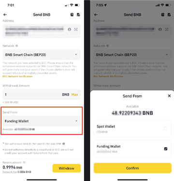 2.選擇要提現的加密貨幣,此處以BNB為例。然後點擊【通過加密貨幣網絡發送】。
