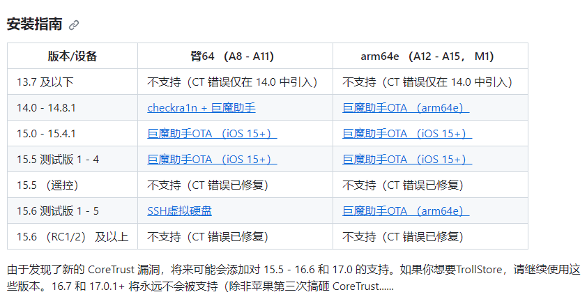 1、我先看看版本的兼容性,可以直接的打開本網站下載自己需要的版本號https://github.com/opa334/TrollStore/進行安裝;