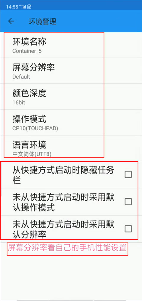 4、下麵就是要設置一下參數,像屏幕分辨率、顏色深度、操作模式等,屏幕分辨率是看自己手機性能設置的。