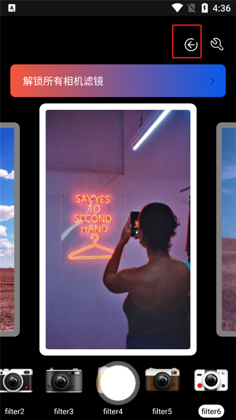 1、進入軟件,它為用戶提供了海量的膠卷濾鏡,你隻需選擇自己喜歡的濾鏡,點擊中間的拍照鍵即可;