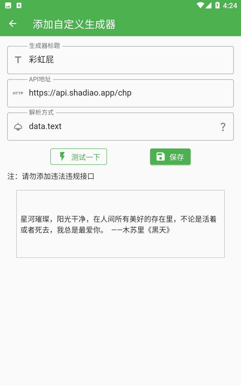 3、也可以自定義生存器,輸入標題、地址和解析方式。