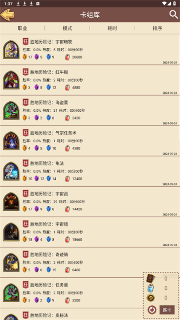 4、點擊【卡組庫】可以查看職業、模式、耗時等詳細信息