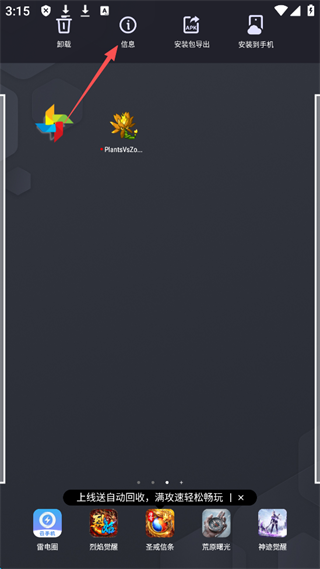 1、在桌麵上長按折相思遊戲盒子破解版圖標,向上拖拽至“信息”,因手機版本不同,略有不同。