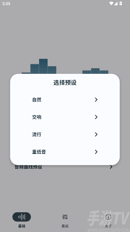 6、選擇音頻曲線預設,可以自由選擇自然、交響、流行、重低音進入調音